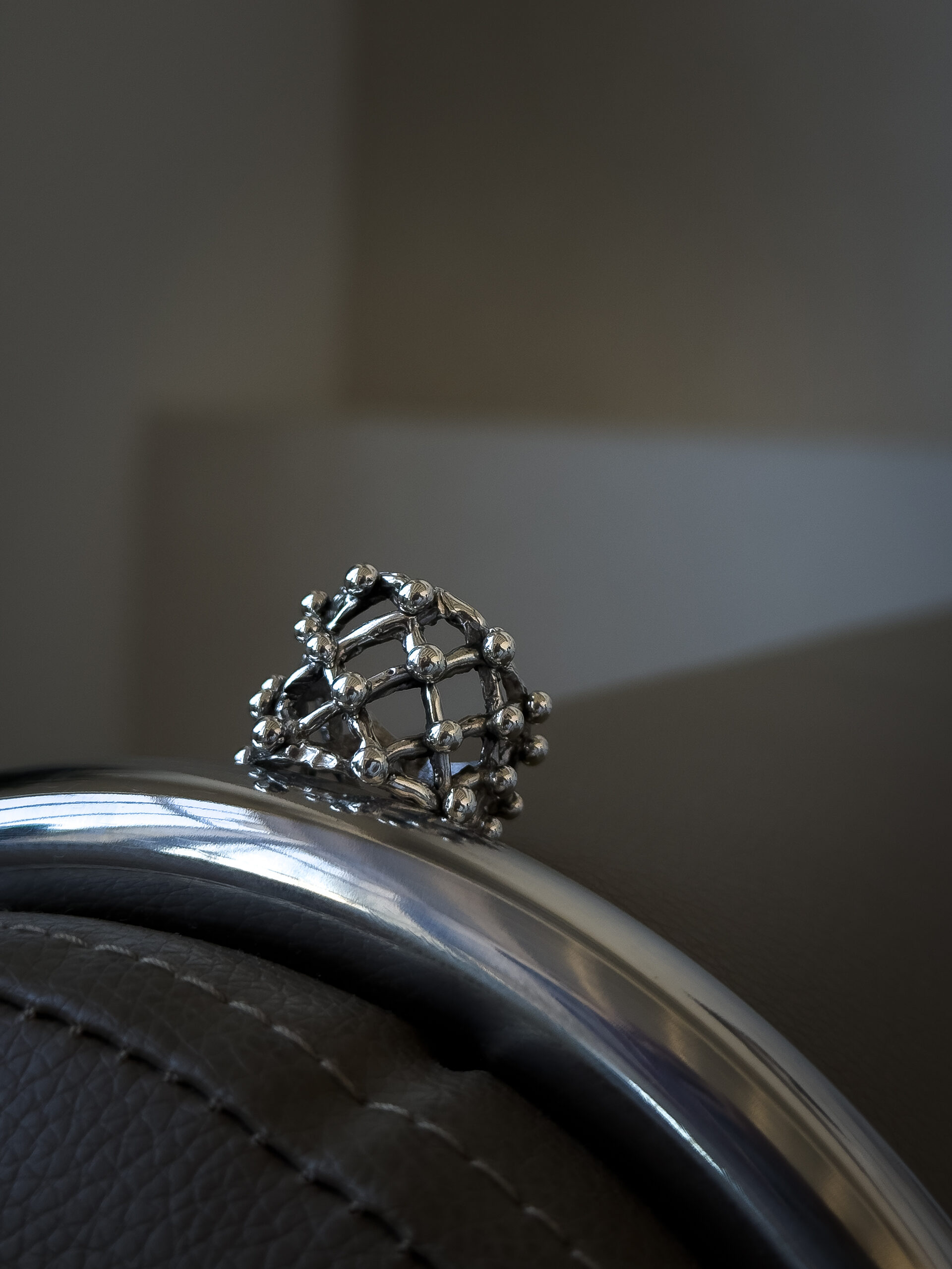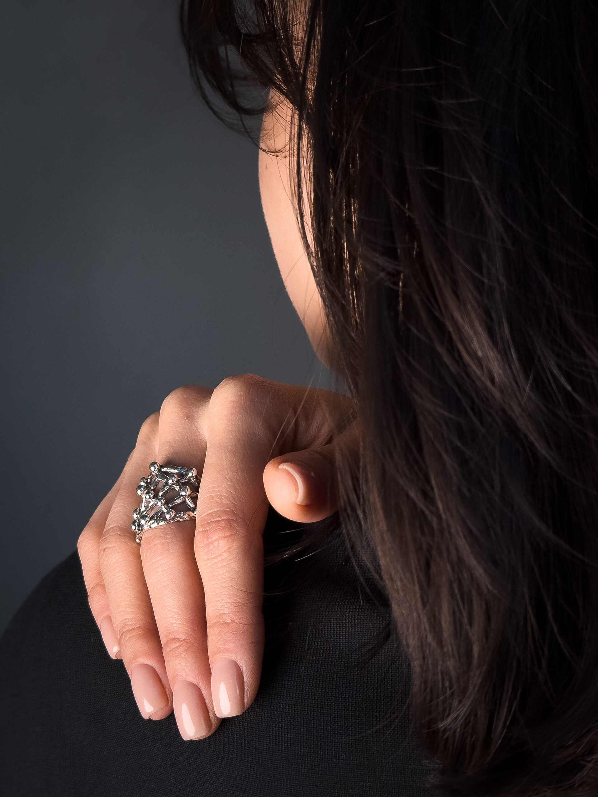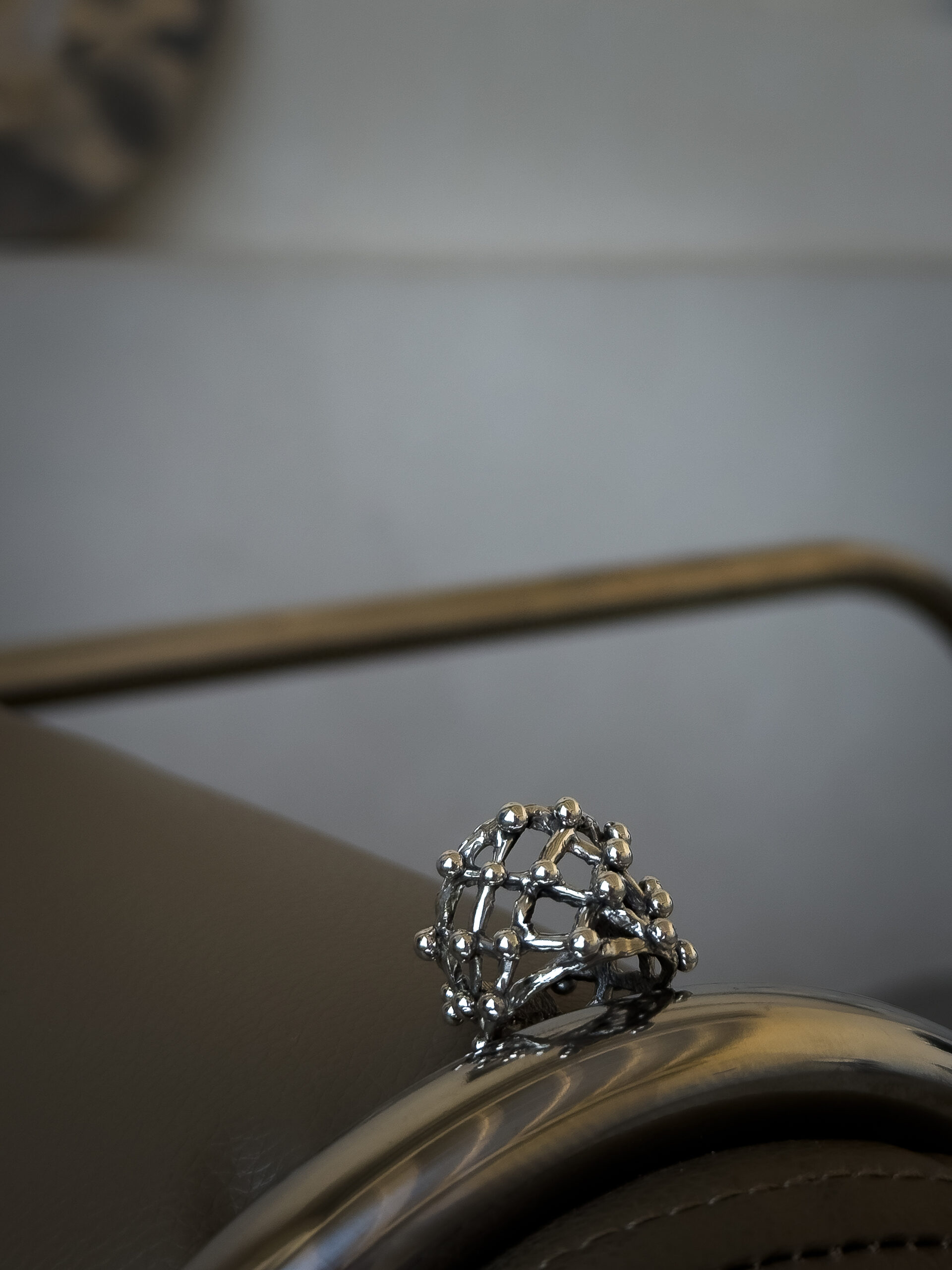 Дизайн этого кольца напоминает паутину с множеством отсеков, легкое и очень удобное в носке, но не менее интересное и эффектное