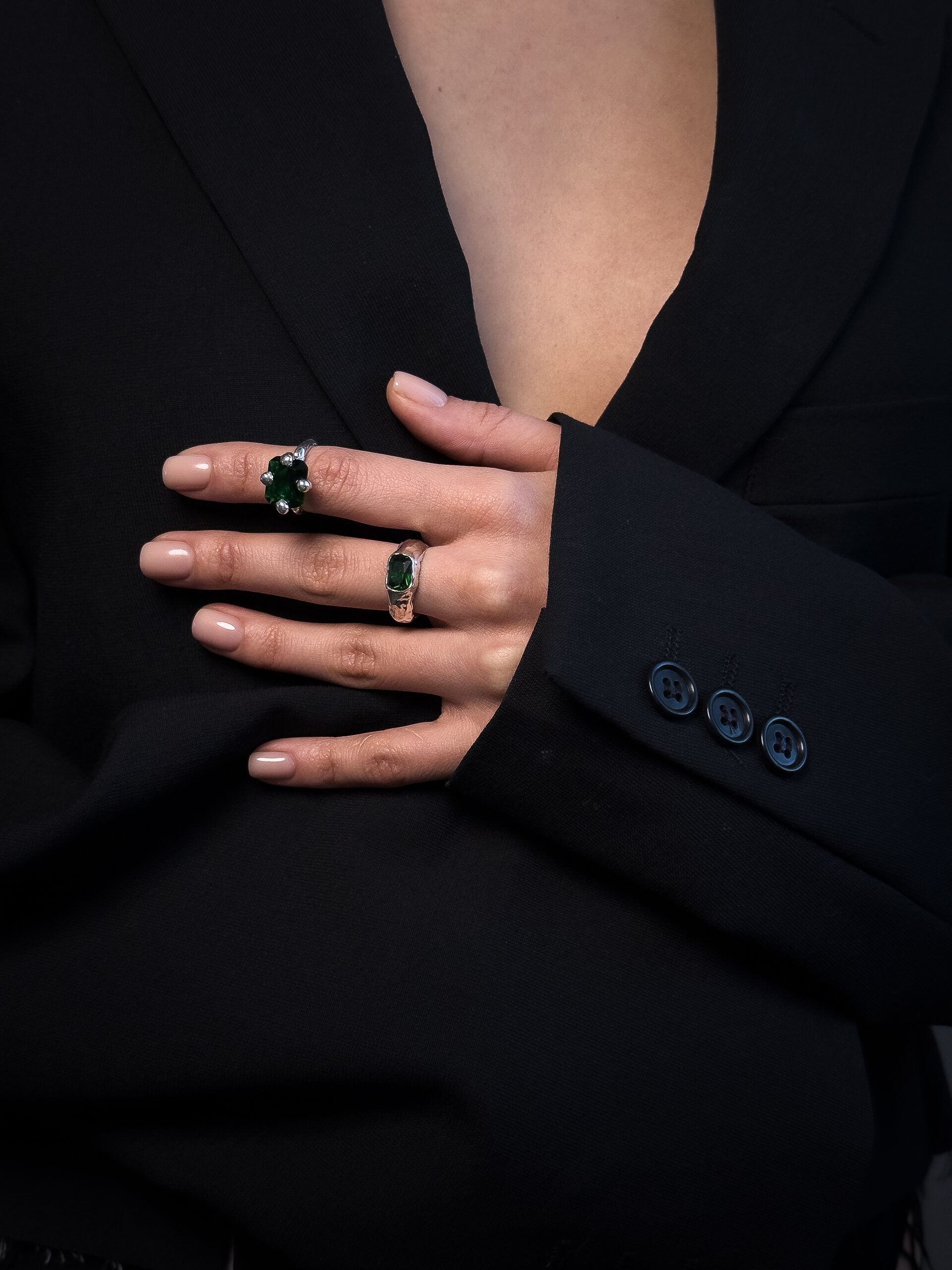 Это кольцо воплощение элегантности и современного стиля. Яркий изумруд, который сдерживают легкие серебряные лапки ,придает образу утонченность и загадочность. Идеально подходит для тех, кто ценит уникальные детали и готов привлекать внимание. Этот акцент на пальце станет не только украшением, но и настоящим символом стиля!
