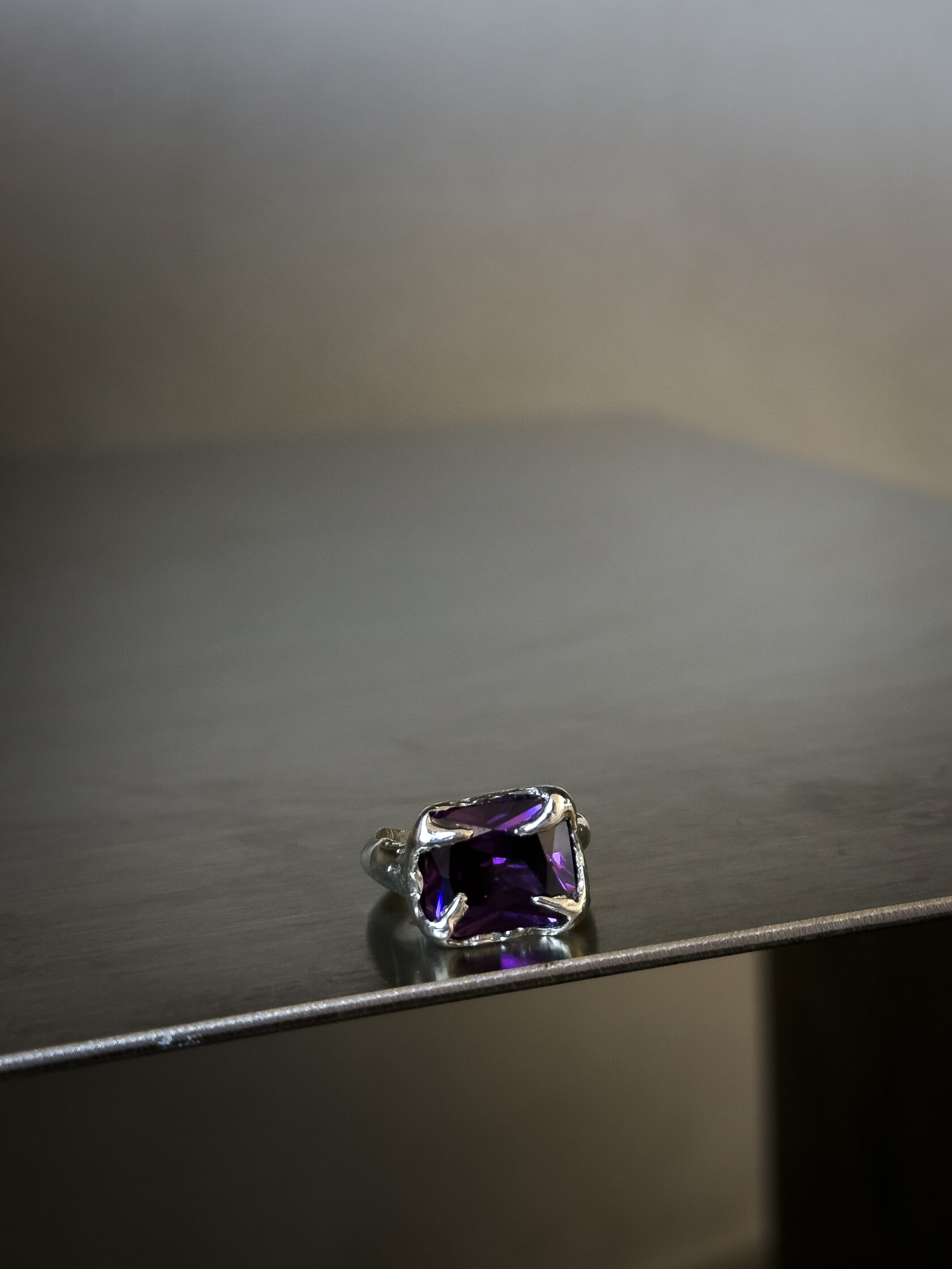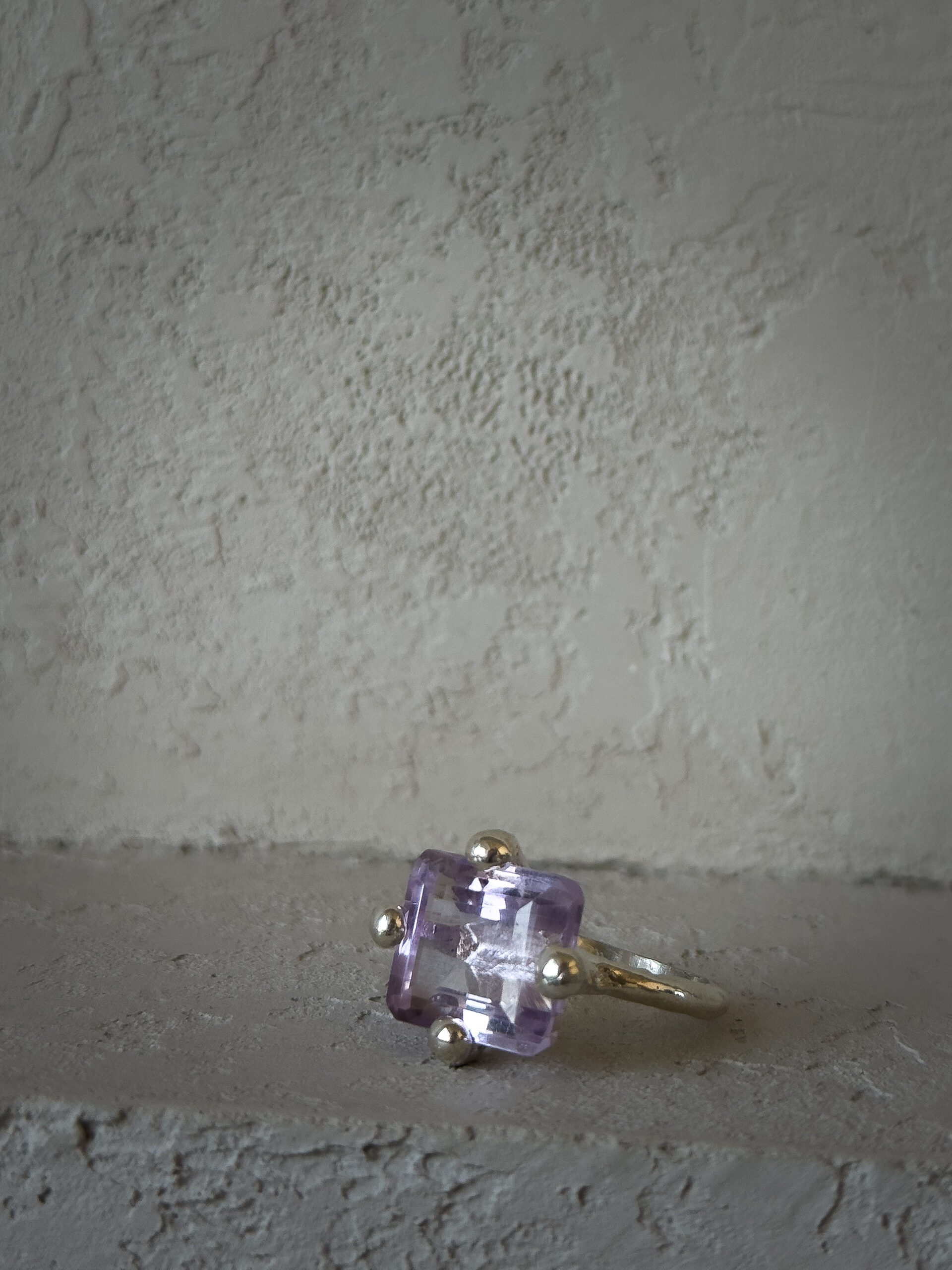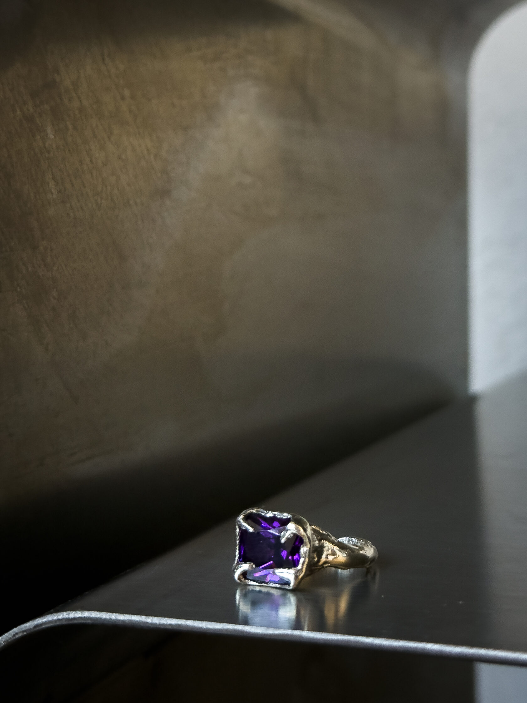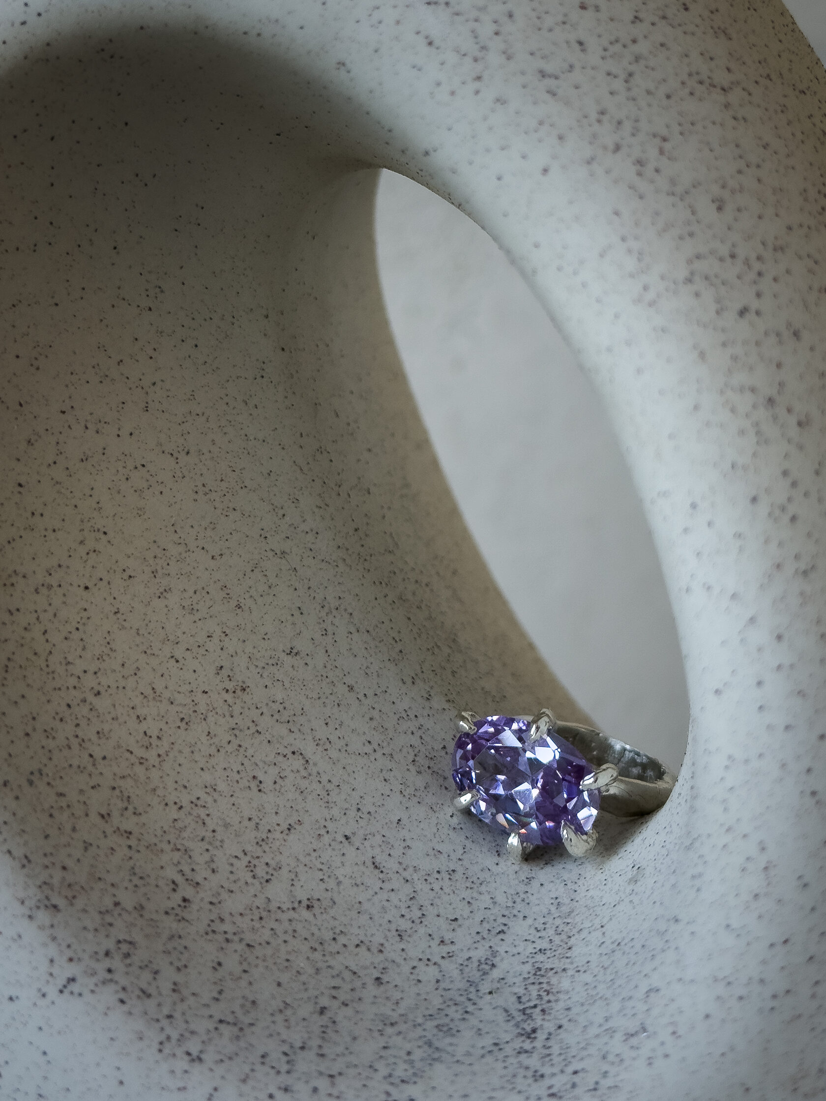 Серебро с матовой текстурой и крупный огранённый аметист оттенка лаванды — минимализм с настроением. Аметист считается камнем внутренней гармонии, помогает сбавить темп, сфокусироваться и не поддаваться хаосу вокруг. Это кольцо — для тех, кто умеет сохранять спокойствие даже в ураган. Красота без суеты.