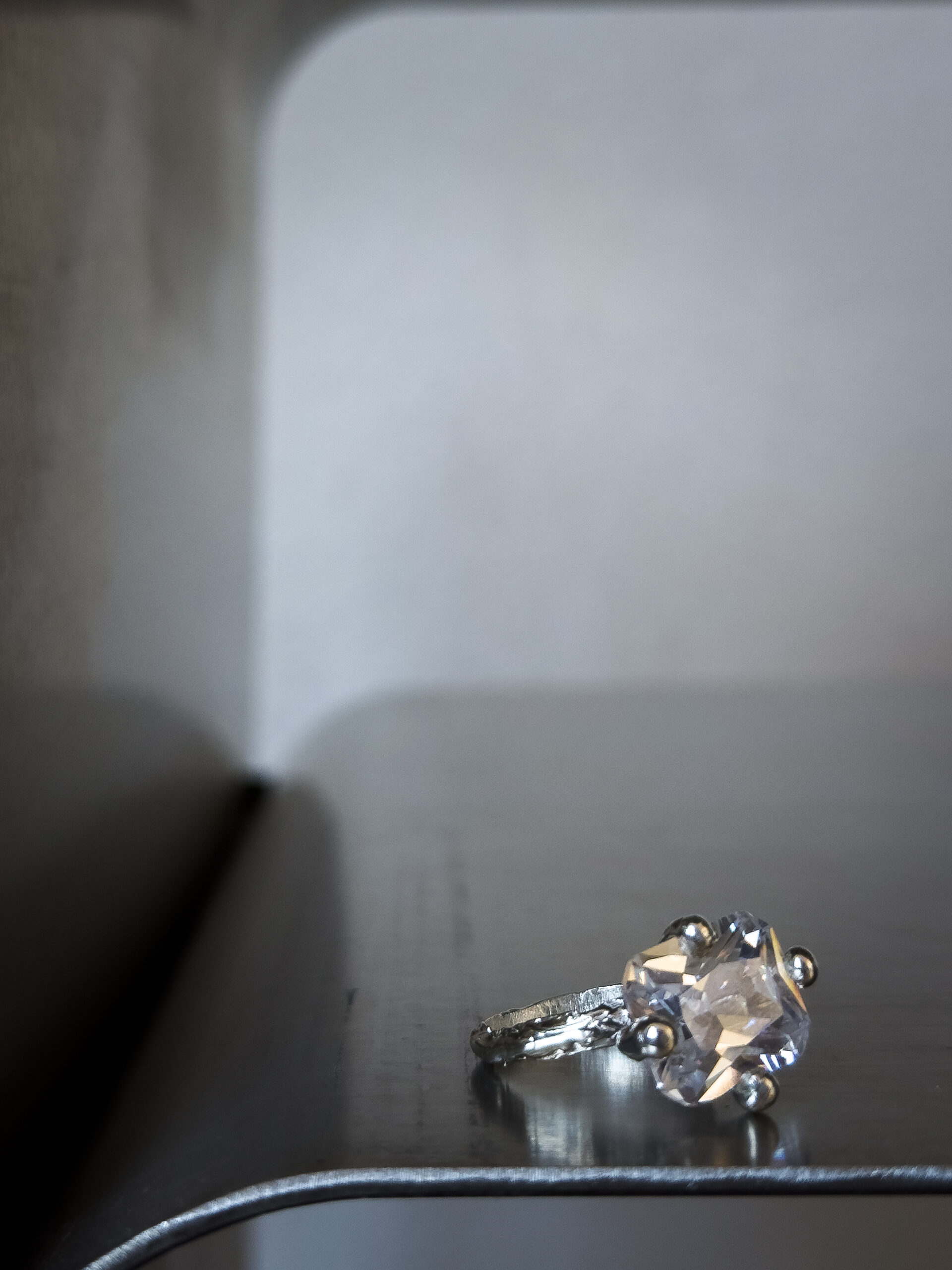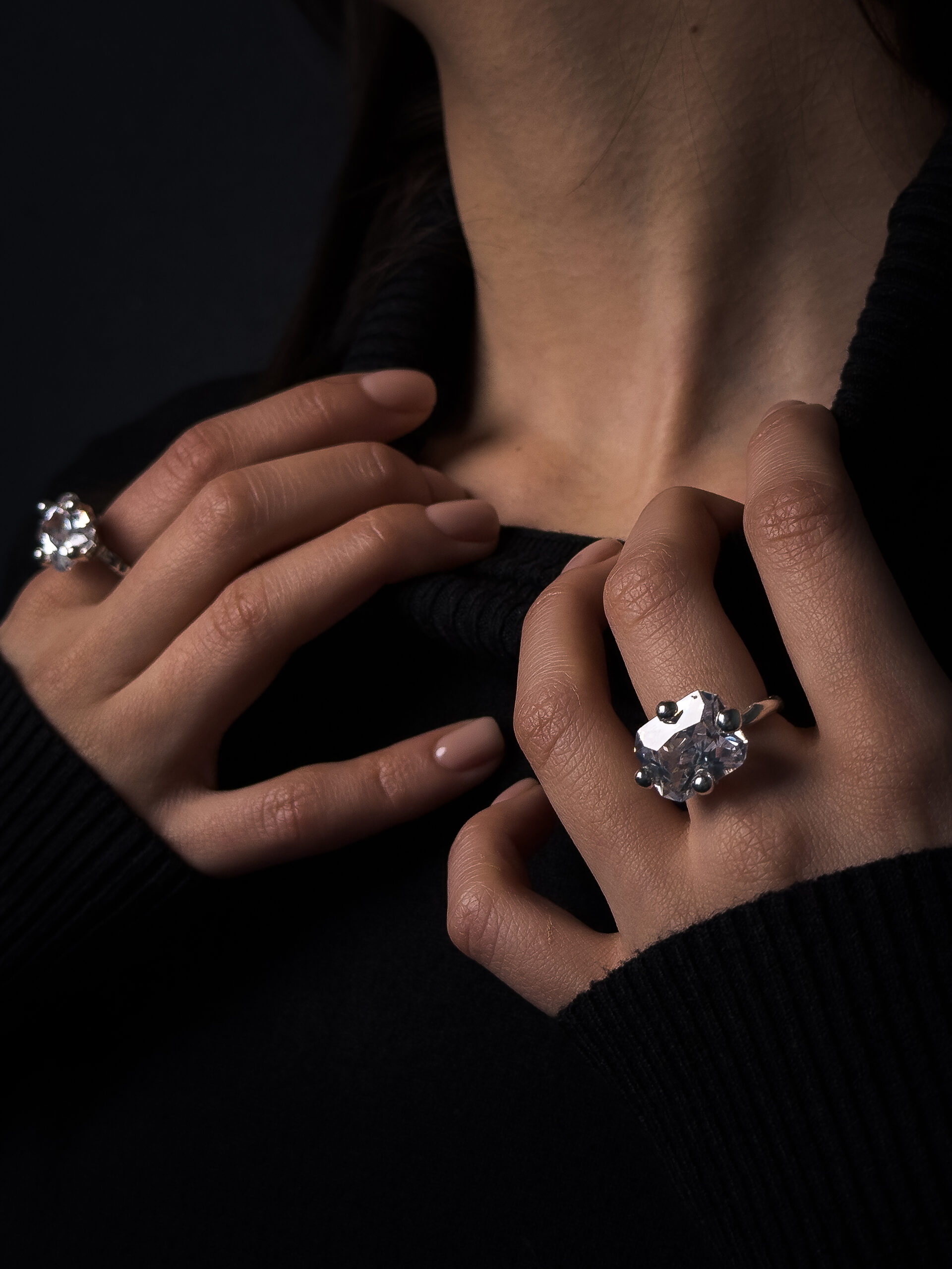 Крупный кристалл, лаконичное серебро и никакой глянцевой показухи. Это кольцо не стремится казаться чем-то другим — оно само по себе эффектное. Идеально для тех, кто выбирает стиль, а не логотип. Блеск — есть. Сваровски — нет.